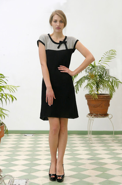 Blusa nude con aplicaciones en negro y falda mini marengo con aplicación.